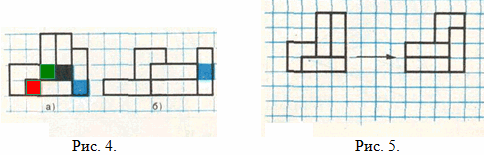 Пусть есть уголок, содержащий клетку первой или второй строки. Возьмём самый правый из таких уголков. Ясно, что красная клетка на рис. 4 (уголок, изображенный на нём, – самый правый) покрыта горизонтальным прямоугольником, иначе укладка вылезет за пределы полосы. Синяя клетка либо лежит за пределами полосы, либо покрыта вертикальным прямоугольником – (здесь есть два случая – а) и б)). В случае б) укладка невозможна – это видно из рисунка. В случае а) раз синяя клетка покрыта вертикальным прямоугольником, то чёрная и зелёная клетки тоже покрыты вертикальными прямоугольниками. Перестроив конфигурацию, как показано на рис. 5, мы "поднимем" уголок так, что он уже не будет содержать клеток первых двух строк.