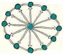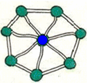В городе одна синяя площадь и n зелёных, причём каждая зелёная площадь соединена улицами с синей и с двумя зелёными, как показано на рисунке. На каждой из 2n улиц ввели одностороннее движение так, что на каждую площадь можно проехать и с каждой – уехать. Докажите, что с каждой площади этого города можно, не нарушая правил, доехать до любой из остальных.