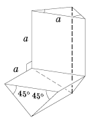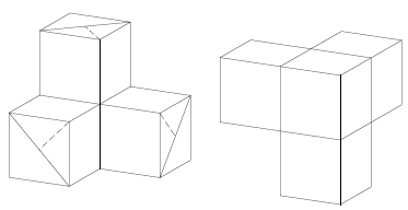 Разрежем куб на 8 кубиков. Возьмём один из этих кубиков и приложим к нему три соседних кубика. Куб можно составить из двух таких (невыпуклых) фигур, каждая из которых составлена из четырёх кубиков (см. рис.). Возьмём одну из этих фигур и отрежем от неё три ребра исходного куба, проведя три плоскости, проходящие через диагонали граней маленьких кубиков параллельно рёбрам исходного куба; на рис. слева эти диагонали изображены сплошными линиями. (Вместе с рёбрами мы отрезаем три треугольные призмы; эти призмы пересекаются.) В результате получим невыпуклую фигуру, которую легко можно разрезать на три кирпичика; разрезы нужно провести по пунктирным линиям на рис. слева. Из двух таких фигур составляется выпуклая фигура, которая получается при отрезании от исходного куба шести рёбер (точнее говоря, шести пересекающихся призм).