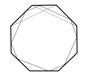 Решение 2:Каждый раз, когда шар отражается от некоторой стороны, будем отражать весь наш многоугольник относительно этой стороны и смотреть на продолжение движения шара в новом многоугольнике. Тем самым траектория шара распрямится. После 2n таких отражений мы получим многоугольник, который получается из исходного композицией 2n осевых симметрий. Эта композиция является параллельным переносом (композиция двух симметрий относительно соседних сторон – поворот на угол 2π/n). "Распрямлённая" траектория шара представляет собой отрезок, соединяющий две точки, получающиеся друг из друга этим переносом. Поэтому длина траектории равна длине вектора этого параллельного переноса, а её угол наклона к борту бильярда равен углу между этим вектором и стороной многоугольника, то есть он определен однозначно. Таким образом, есть только один способ выпустить шар в соответствии с условиями задачи (точнее, два – в одном случае он "обходит" стороны по, а в другом – против часовой стрелки). Он указан в решении 1.