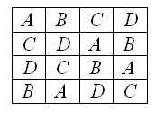 Квадрат расчерчен на 16 равных клеток. Каждую из букв A, B, C, D расставьте в этих клетках по четыре раза таким образом, чтобы на каждой горизонтали, каждой вертикали и двух больших диагоналях не было одинаковых букв.