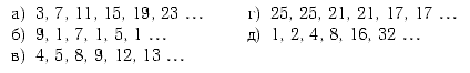 а) 27, 31 — каждое следующее число больше предыдущего на 4; б) 3, 1 — на нечётных местах: каждое следующее число меньше предыдущего на 4; все числа на чётных местах равны 1; в) 16, 17 — соединены два ряда, в обоих каждое следующее число больше предыдущего на 4, но первый ряд начинается с 4, а второй — с 5; г) 13, 13 — числа в следующей паре на 4 меньше чисел в предыдущей паре; д) 64, 128 — последовательные степени числа 2.