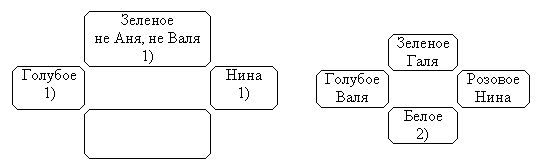 Перепишем условие задачи, занумеровав данные. 1) Девочка в зеленом платье (не Аня и не Валя) стоит между девочкой в голубом платье и Ниной. 2) Девочка в белом платье стоит между девочкой в розовом платье и Валей. Какое платье на каждой из девочек?