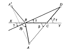 Ломаная ABCD определяется заданием двух углов: ∠BCA = β и ∠CDB = γ; при этом, если обозначить через X и Y точки на продолжениях отрезка BC, то (поскольку треугольники ABC и BCD равнобедренные, см. рисунок) ∠XBA = 2β, a ∠YCD = 2γ. Углы будем считать направленными, скажем, против часовой стрелки.
