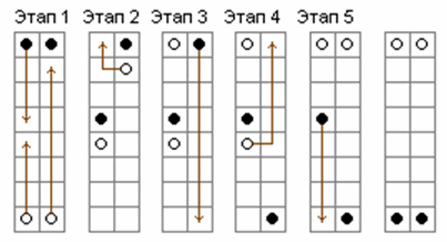 Пример. Разобьём фишки на четвёрки, стоящих на двух соседних вертикалях. Каждую четвёрку передвинем за 30 ходов так, как показано на рисунке: