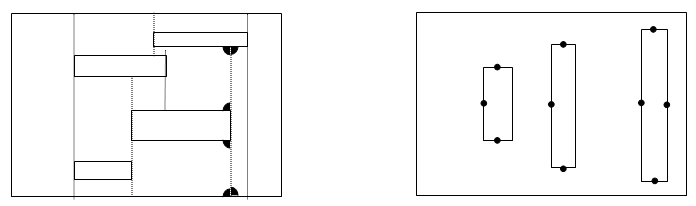 Оценка. Будем считать, что одна из сторон листа вертикальна. Вдоль каждой вертикальной "стороны" одной из дырок проведём вертикальный разрез до "упора" в горизонтальную сторону соседней дырки или в край листа. Повторим эту процедуру для всех дырок (рис. слева). После этого лист "распадётся" на некоторое количество m прямоугольников (действительно, у полученных частей все углы прямые).