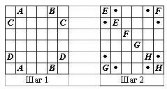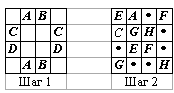 Покажем, что этого числа проверок достаточно. Для этого определенным образом разобьём все узлы на пары (узлы в паре пометим одинаковыми буквами) и для каждой проверим, что ток проходит между узлами этой пары. а) "Линия тока" A–A (B–B) очевидно пересекается с линиями C–C и D–D (см. шаг 1). Таким образом, все узлы, помеченные буквами от A до D, связаны проводами (принадлежат одной компоненте). Остальные узлы также принадлежат этой компоненте – например линия тока E–E проходит либо через A, либо через C (см. шаг 2).
