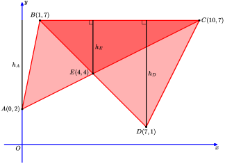 ТреугольникиBAC,BDCиBECимеют общее основаниеBCи высотыhA= 7 - 2 = 5,hD= 7 - 1 = 6 иhE= 7 - 4 = 3. Следовательно,