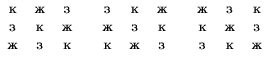 Составьте куб3×3×3 из красных, жёлтых и зелёных кубиков1×1×1 так, чтобы в любом бруске3×1×1 были кубики всех трёх цветов.