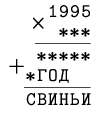 Заметим, что при умножении 1995 на первую цифру множителя получается четырёхзначное число (*ГОД), у которого последние три цифры различны (по условию, разные буквы обозначают разные цифры). Поэтому число *ГОД не может быть равным 1995 и 3990. Значит, для первой цифры осталось только три варианта: 3, 4, 5. А всего вариантов выбора первой и последней цифры множителя осталось 12 (почему?).