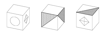 Похоже, первая картинка отличается от второй просто поворотом, то есть две невидимые вертикальные грани на первом рисунке — треугольники. Нарисуем их на нашем кубике. Ага, теперь не получается на него посмотреть так, чтобы увидеть третью картинку. Что-то тут не так, но мы вроде где-то близко... Очень уж хочется ''спрятать'' два треугольника со второй картинки на задние грани в первой... Идея — их надо ещё перевернуть! То есть вторая картинка — это не просто повёрнутая на 180 градусов первая, а ещё и перевёрнутая! Верхняя грань на второй картинке была внизу на первой! Рисуем... Теперь всё сходится и на третьей картинке.
