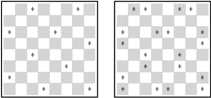Отметьте на доске 8×8 несколько клеток так, чтобы любая (в том числе и любая отмеченная) клетка граничила по стороне ровно с одной отмеченной клеткой.