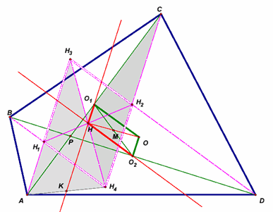 Четырёхугольник H1H2H3H4, образованный ортоцентрами, есть параллелограмм, стороны которого лежат на перпендикулярах, проведённых из вершин четырёхугольника к соответствующим диагоналям. Поэтому H – точка пересечения диагоналей этого параллелограмма и делит их пополам (см. рис.).