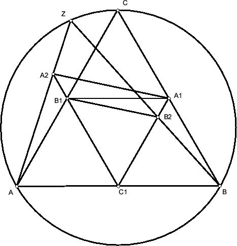 ∠BAZ = ∠A2A1C1. Так как прямые AA2 и BB2 параллельны, ∠A2A1C2 = ∠B1B2C, следовательно, ∠AZB = ∠B1C1B2 = ∠C, то есть точка Z лежит на описанной окружности Ω треугольника ABC.