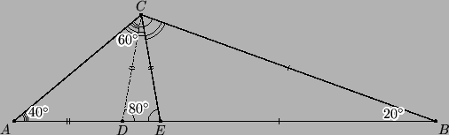 Отложим на стороне AB отрезок BD, равный BC. Тогда треугольник BCD – равнобедренный с углом при вершине 20°, поэтому углы при основании равны 80° (см. рис.). Пусть CE – биссектриса угла C. Тогда ∠BCE = 60°, поэтому ∠AEC = 20° + 60° = 80°. Таким образом, в треугольнике DEC равны два угла, поэтому он равнобедренный. Угол при его вершине C равен 20°, поэтому ∠ACD = 40°. Значит, треугольник ACD также равнобедренный, следовательно,