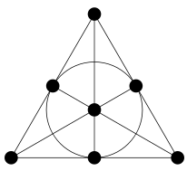 Проверим, что Коля ничего не узнал. Рассмотрим карту с номером s. Покажем, что она могла попасть к Грише, если он назвал сумму a. Для этого надо дополнить эту карту двумя другими с суммой номеров a – s. Легко видеть, что существует три различные пары номеров, дающие в сумме a – s. Из них две, возможно, испорчены тем, что туда входит карта с номером s или закрытая карта, но как минимум одна пара остаётся. Ей мы и дополним набор Гриши. Такие же рассуждения показывают, что любая карта могла оказаться и у Лёши. Второй способ. Гриша строит конечную проективную плоскость порядка 2 (см. рис.) так, чтобы одной из её прямых была его тройка карт (остальные шесть прямых пересекаются с этой тройкой ровно по одной карте). То есть сообщает "у меня одна из семи следующих троек карт ...".