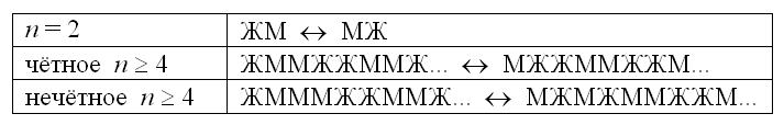 При n = 2 и n ≥ 4 вечно живые расстановки 1×n существуют: каждая из нижеперечисленных расстановок имеет период 2, то есть каждую вторую минуту возвращается в исходное состояние.