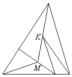 Решение 2: Пусть в результате получилось n треугольников. Сумма их углов равна 180n°. Но эту сумму можно подсчитать и по-другому. Рассмотрим все точки, являющиеся вершинами этих треугольников. Разобьём эти точки на три типа. К первому отнесём те точки, в которых сходящиеся в них углы треугольников составляют полный угол (как точка М на рисунке). Ко второму – точки, в которых эти углы составляют развёрнутый угол (как точка К). Наконец, к третьему типу отнесём вершины исходного треугольника. Если имеется m точек первого и k точек второго типа, то общая сумма углов равна 360m° + 180k° + 180°. Отсюда n = 2m + k + 1.