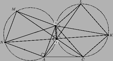 ∠NXA = ∠NBA = ∠LBK = ∠LXK, а значит, точки A, X, L также лежат на одной прямой. Аналогично, точки M, C, X лежат на одной прямой. Итак, X – точка пересечения этих трёх прямых.