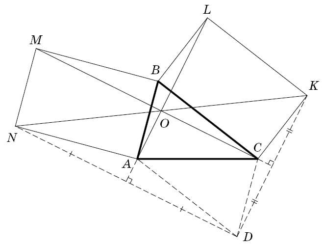 Дан остроугольный треугольник ABC. На сторонах AB и BC во внешнюю сторону построены равные прямоугольники ABMN и LBCK так, что AB = KC.