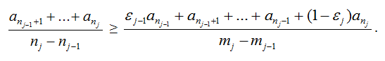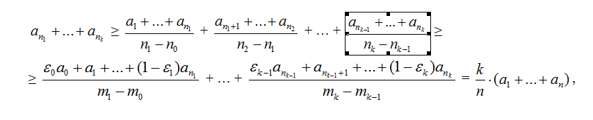 (добавив к группе чисел число, меньшее их всех, мы уменьшим среднее арифметическое). б) Положим n0 = m0 = a0 = 0 и возьмём целые числа nj = mj + εj, где 0 ≤ ε < 1. Рассмотрим ступенчатую функцию, задаваемую равенствами f(x) = aj при j – 1 < x ≤ j. Поскольку функция не убывает, её среднее значение на промежутке уменьшается, когда оба конца промежутка сдвигают влево (даже с изменением длины промежутка). (Среднее значение – это площадь под графиком функции на заданном промежутке, деленная на длину этого промежутка.) В частности,
