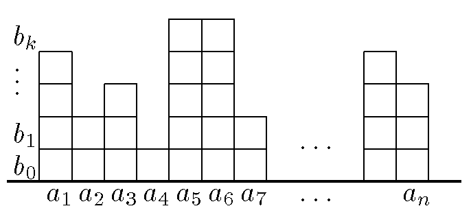 Рассмотрим следующую конструкцию. Возьмем набор кубиков и будем строить из них "башенки" — столбики высотойa1,a2, ...,an(смотрите рисунок). Посчитаем двумя способами, сколько кубиков нам для этого понадобится. Считая по столбцам получаем, что количество кубиков равно сумме чисел первого набора. Другой способ подсчета — по слоям. Количество кубиков в первом слое (стоящих на полу) равноb0=n, в следующем слое —b1, и т. д., количество кубиков вi-м слое равноbi.