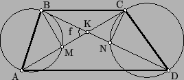 Пусть боковые стороны трапеции – это стороны AB и CD. Обозначим через M и N вторые точки пересечения прямых AC и BD и окружностей с диаметрами AB, CD соответственно (см. рис.). Если прямая AC касается окружности с диаметром AB, то мы полагаем M = A, аналогично поступим, если прямая BD касается соответствующей окружности.