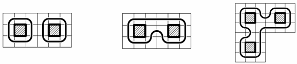 Сначала обойдём один холл, например, по часовой стрелке (рис. слева). Рассмотрим соседний с ним холл и обойдём его аналогично. Для того чтобы обойти оба холла, достаточно поменять направление движения в двух парах клеток вдоль границы холлов (рис. в центре). Рассмотрим следующий холл, который граничит с уже обойдёнными. Поменяв направление движения аналогично предыдущему, получим способ обхода трёх холлов (рис. справа). Добавляя новые холлы по одному и меняя направление движения указанным образом, мы сумеем обойти весь замок.