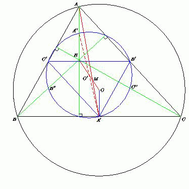 Поскольку HA"=OA' , то середина отрезка A'A" совпадает с точкой O' . Значит, A'A" – диаметр окружности, описанной около треугольника A'B'C' . Поэтому основание высоты треугольника ABC также лежит на этой окружности. Аналогично для оснований остальных высот.