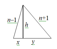Пусть стороны треугольника равны n – 1, n и n + 1, отрезки, на которые высота делит основание, – x и y, высота – h. (см. рисунок).