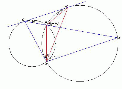 Из теоремы об угле между касательной и хордой следует, что ∠CAD = ∠CAB + ∠DAB = ∠BCD + ∠BDC. Поскольку DBE – внешний угол треугольника DBC, то и ∠DAE = ∠DBE = ∠BCD + ∠BDC = ∠CAD.