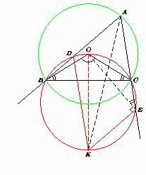 Без ограничения общности рассмотрим случай, когда точка D лежит на стороне AB, а точка E – на продолжении стороны AC за точку C (см. рис.). Обозначим ∠A = α. Тогда ∠BOC = 2α, ∠OBC = ∠OCB = 90° – α.