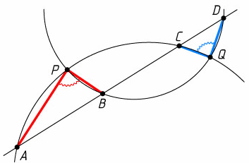 Две окружности пересекаются в точках P и Q. Прямая пересекает эти окружности последовательно в точках A, B, C и D, как показано на рисунке.