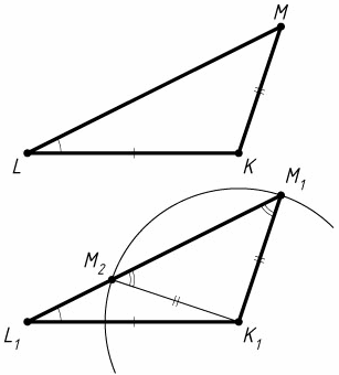 Доказательство. Пусть дан треугольник KLM (см. рис.). Построим треугольник K1L1M1 по данным сторонам K1L1 = KL, K1M1 = K1L1 и углу K1L1M1, равному углу KLM. Для этого от начала произвольного луча отложим отрезок L1K1 = LK, затем в одну из плоскостей, на которые разбивает плоскость прямая L1K1, отложим луч L1P, образующий с лучом L1K1 угол, равный данному углу KML. С центром в точке K1 построим окружность радиусом, равным KM. Если эта окружность не пересекается с построенным лучом, то задача не имеет решений; если окружность имеет с лучом единственную общую точку, то задача имеет одно решение; если окружность пересекает луч в двух точках M1 и M2 (точка M2 лежит L1 и M1), то треугольник M1K1M2 – равнобедренный, поэтому ∠K1M2L1 = ∠K1M2M1 = ∠K1M1M2 = 180° – ∠K1M1L1.