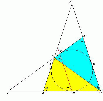 Пусть вписанная окружность треугольника ABC (она же вписанная окружность равнобедренного треугольника CPE) касается сторон BC и AB в точках K и L соответственно. Тогда FE = EK = KC = CM = AM = AL, поэтому AD = AL + LD = EF + DF = DE.