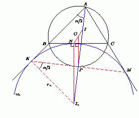 Пусть R – радиус описанной окружности треугольника ABC, ra – радиус окружности ωa, ∠A = 2α. Из прямоугольного треугольника KPIa находим, что PIa = KIa sin∠PKIa = ra sin α.