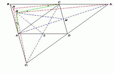 Пусть M – середина CD, а L – середина AD. Достроим параллелограмм ABCD до треугольника BA1C1 так, чтобы отрезок AC был средней линией этого треугольника. ACA1D и CAC1D – параллелограммы, а точки A, M и A1 лежат на одной прямой. В треугольнике AKA1 медиана KM равна половине AM стороны AA1, значит, ∠AKA1 = 90°. Аналогично ∠CKC1 = 90°. Таким образом, ∠CKA1 = 90° – ∠A1KC1.