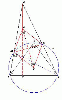 Пусть O – центр описанной окружности ω остроугольного треугольника ABC. Окружность ω1 с центром K проходит через точки A, O и C и пересекает стороны AB и BC в точках M и N. Известно, что точки L и K симметричны относительно прямой MN. Докажите, что BL ⊥ AC.