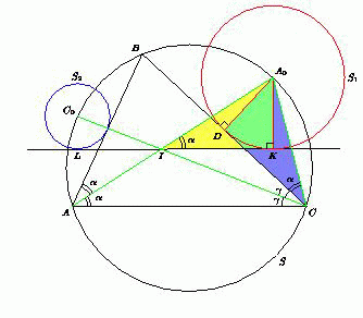 Значит, треугольник A0CI – равнобедренный, A0I = A0C. Окружность S1 касается BC в середине D стороны BC. Прямоугольные треугольники A0KI и A0DC равны по катету и гипотенузе, поэтому  ∠A0IK = ∠A0CD = α = ∠A0AC.