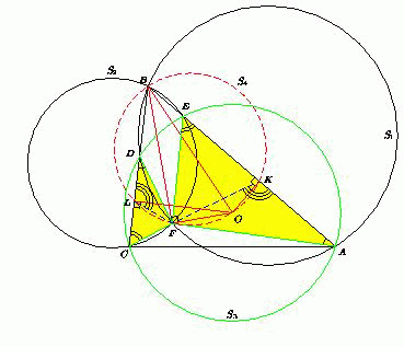Так как AE и CD – хорды окружности S3, то серединные перпендикуляры к отрезкам AE и CD пересекаются в центре O этой окружности. Значит, точки K и L лежат на окружности с диаметром BO, а так как через точки B, K и L проходит единственная окружность S4, то BO – диаметр окружности S4. Таким образом, точка F лежит на окружности с диаметром BO, поэтому FO ⊥ BO.