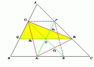 На сторонах BC, CA и AB треугольника ABC выбраны соответственно точки A1, B1 и C1, причём медианы A1A2, B1B2 и C1C2 треугольника A1B1C1 соответственно параллельны прямым AB, BC и CA. В каком отношении точки A1, B1 и C1 делят стороны треугольника ABC?