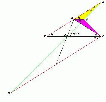 Обозначим ∠ADB = α, ∠CDB = β. Тогда каждый из углов EDA, CBD, CBG, GFA равен α, а ∠CAD = ∠ADC = α + β. Поскольку GAD – внешний угол треугольника AFG, то ∠AGF = ∠GAD – ∠GFA = β.