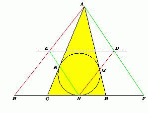 Окружность, вписанная в треугольник ABC касается его сторон AB , BC и CA в точках M , N и K соответственно. Прямая, проходящая через вершину A и параллельная NK , пересекает прямую MN в точке D . Прямая, проходящая через вершину A и параллельная MN , пересекает прямую NK в точке E . Докажите, что прямая DE содержит среднюю линию треугольника ABC .