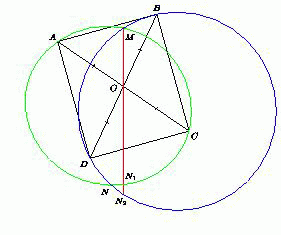 MO·ON1 = AO·OC = BO·OD = MO·ON2, поэтому ON1 = ON2. Значит, точки N1, N2 и N совпадают, а точка O лежит на отрезке MN.
