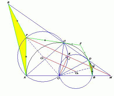 OQ – их диаметры. Тогда O1O2 – серединный перпендикуляр к общей хорде OK. Поэтому точка K лежит на отрезке PQ и OK ⊥ PQ. Таким образом достаточно доказать, что точка M лежит на прямой