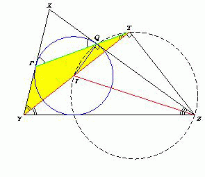 Лемма. Пусть P и Q – точки касания со сторонами соответственно XY и XZ окружности с центром I, вписанной в треугольник XYZ; T – точка пересечения прямых YI и PQ. Тогда ∠YTZ = 90°.