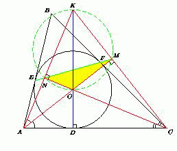 Окружность с центром O вписана в треугольник ABC и касается его сторон AB, BC и AC в точках E, F и D соответственно. Прямые AO и CO пересекают прямую EF в точках M и N. Докажите, что центр окружности, описанной около треугольника OMN, точка O и точка D лежат на одной прямой.