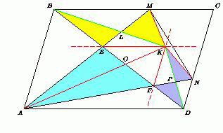 На сторонах BC и CD параллелограмма ABCD взяты точки M и N соответственно. Диагональ BD пересекает стороны AM и AN треугольника AMN соответственно в точках E и F , разбивая его на две части. Докажите, что эти две части имеют одинаковые площади тогда и только тогда, когда точка K , определяемая условиями EK || AD , FK || AB , лежит на отрезке MN .