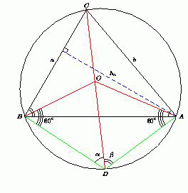 Аналогично ∠ODO = β и ∠OAD = 60°. Рассмотрим треугольники OBD и OAD. По теореме синусов BO : sin α = OD : sin 60° = AO : sin β.