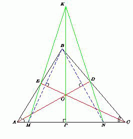 Аналогично ∠KNM = ∠ABC. Значит, треугольник KMN – равнобедренный, KM = MN. Кроме того, прямая CE – серединный перпендикуляр к отрезку BM, а прямая AD – серединный перпендикуляр к отрезку BN, значит, точка O их пересечения – центр описанной окружности треугольника MBN. Поэтому точка O, как и точка K лежит на серединном перпендикуляре l к отрезку MN.